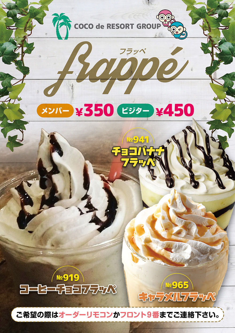 ひんやり美味しいフラッペ販売! 暑い時にはやっぱり冷たくて美味しいものを! 体が欲しがるんですよね~(-ω- ) というわけで、シャリシャリアイスがたまらないっ! フラッペ3種、始めます! ◎定番中の定番!コーヒーチョコフラッペ ◎スイーツ界最強タッグ!チョコバナナフラッペ ◎でもこれが一番おいしいかも…キャラメルフラッペ 日本の暑さに耐えられないあなた! もうガマンしなくていいんですよ:.゚ヽ(*´∀)ノ゚ ※内容や商品番号は店舗によって異なる場合がございます。オーダーの際は、お部屋に設置されたカタログ・POP等でご確認の上、ご注文ください。 ニュース一覧へ