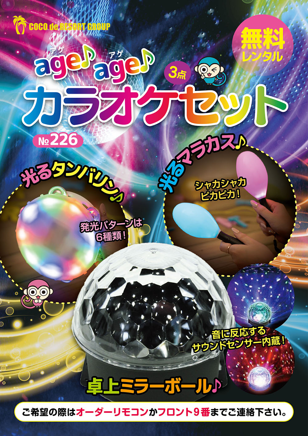 カラオケグッズのレンタル開始ました☆ 実はCOCO de RESORT GROUPでは 全店全室カラオケを設置しているんです( ´∀` ) COCOなら誰にも邪魔されずに思う存分歌えちゃう!! そしてなんと!! COCOではカラオケグッズのレンタルを開始!!!! グッズは光るマラカスや光るタンバリン、 音に反応して赤青緑の色や模様が変化する 卓上型ミラーボール等(*^▽^*) グッズで更にガンガン盛り上げちゃお\(≧◇≦)/ 盛り上がりすぎて歌い疲れても大丈夫!! お風呂に入ってベッドで横になれるんです( *´艸`) COCO de RESORT GROUPで 楽しいひと時をお過ごし下さい(^_-)-☆ ※内容や商品番号は店舗によって異なる場合がございます。オーダーの際は、お部屋に設置されたカタログ・POP等でご確認の上、ご注文ください。 ニュース一覧へ