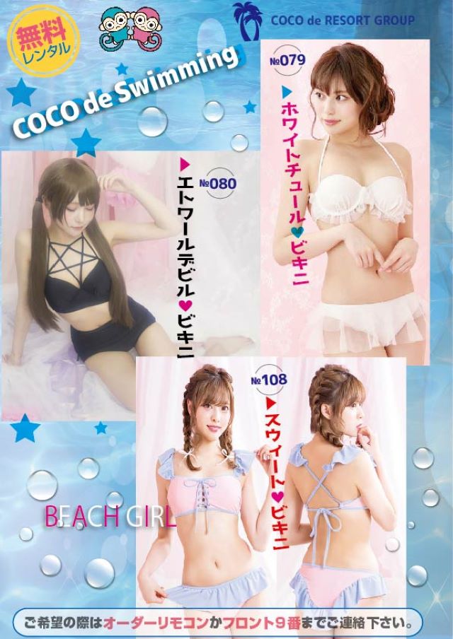 無料水着レンタルにビキニ追加! ☆.。.:*・゜☆.。.:*・゜☆.。.:*・゜☆ 水着レンタル ビキニ追加 ☆.。.:*・゜☆.。.:*・゜☆.。.:*・゜☆ 今年もあつ~い夏がやってきましたね・・・・ そんな暑い夏は水着で過ごしちゃいましょう! 水着レンタルに新たにかわいい三種のビキニが仲間入り♥ 涼しい水着でこの夏を楽しみましょう♪ ※内容や商品番号は店舗によって異なる場合がございます。オーダーの際は、お部屋に設置されたカタログ・POP等でご確認の上、ご注文ください。 ニュース一覧へ