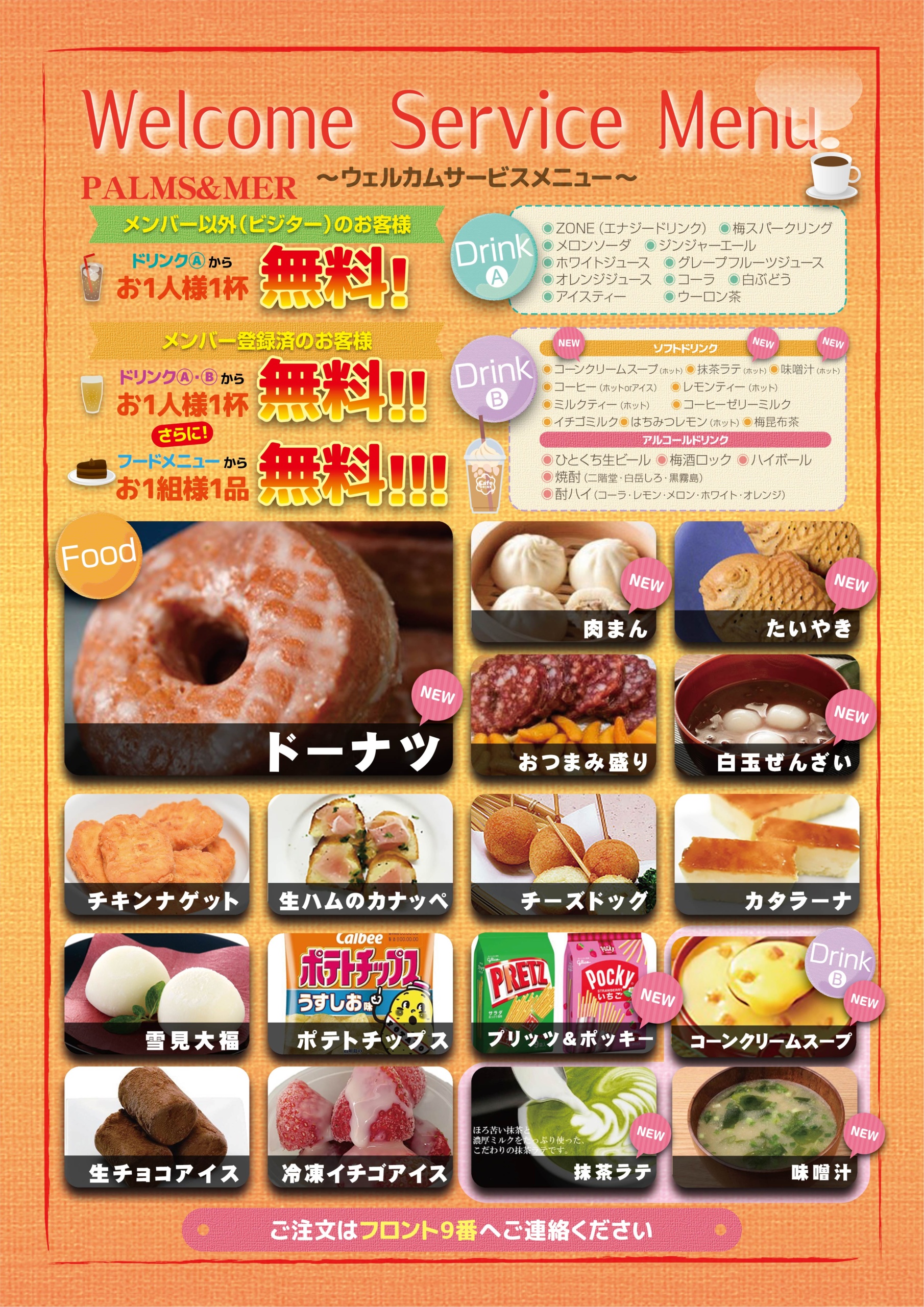 ウェルカムサービスリニューアル-PALMS&MER- 秋冬ウェルカムメニュー ☆**‥…★…‥**☆◆☆**‥…★…‥**☆ ウェルカムメニュー 🍂秋冬バージョンにリニューアル🍁 ☆**‥…★…‥**☆◆☆**‥…★…‥**☆ ウェルカムドリンク・フードメニューが 秋冬バージョンに変わりました(*^^)v カナッペや苺アイス ナゲット、雪見大福・カタラーナなどの 人気商品はそのまま♬♪ 新たに‥‥‥毎年人気の白玉ぜんざい たいやき・ドーナツ・肉まん ポッキー&プリッツなども 今からの時期にピッタリなメニューが追加!!!! ぜひ、色々な味を楽しんで下さいね😘 ニュース一覧へ