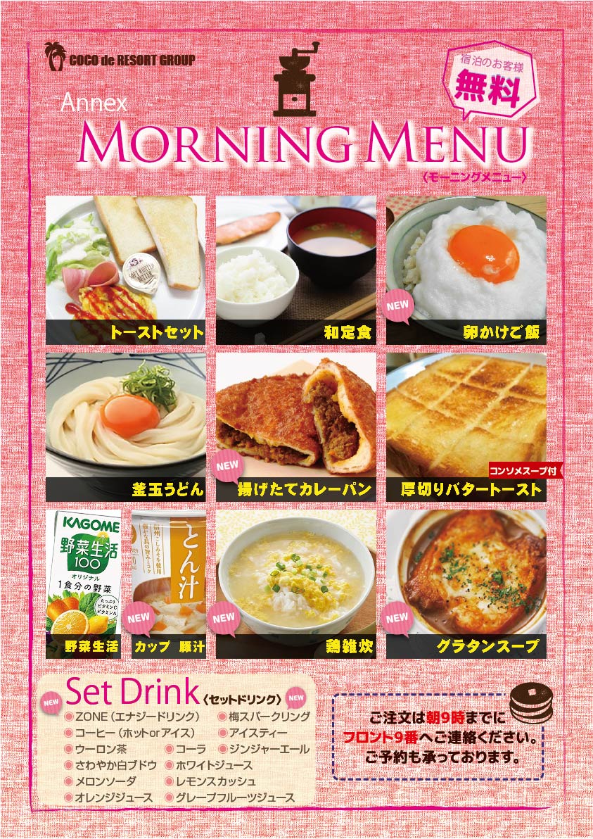 モーニングサービスリニューアルーAnnex 秋冬モーニングメニュー ☆**‥…★…‥**☆◆☆**‥…★…‥**☆ モーニングメニュー 🍂秋冬バージョンにリニューアル🍁 ☆**‥…★…‥**☆◆☆**‥…★…‥**☆ モーニングメニューが装いも新たに 秋冬バージョンに変わりました(*^^)v 和定食やトーストセットの定番や 窯玉うどん・厚切りバタートーストなどの 人気商品はそのまま♬♪ 新たに‥‥‥ 揚げたてカレーパン・鶏雑炊 卵かけご飯・グラタンスープ・カップ豚汁 今からの寒い時期にピッタリな あつあつメニューが追加!!!! ぜひ、宿泊した際は、しっかり朝ごはん!!! 色々な味を楽しんで下さいね😘 ニュース一覧へ