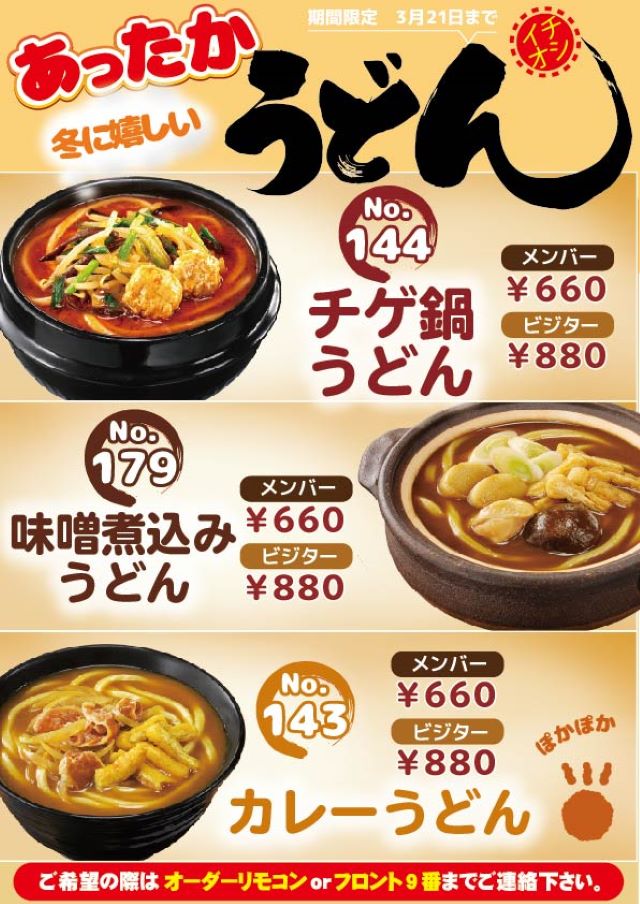 期間限定!チゲ鍋うどん・味噌煮込みうどん・カレーうどん販売!!!