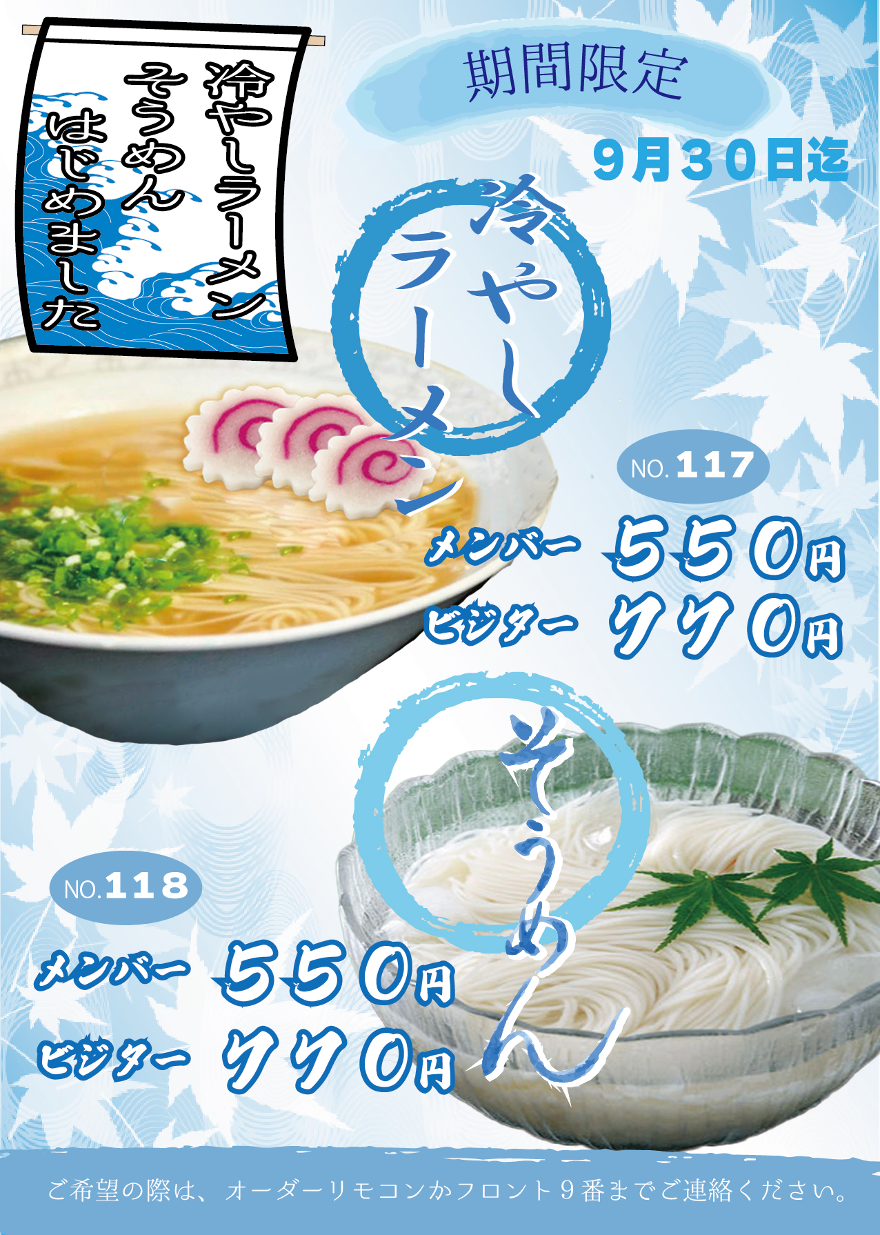 期間限定 冷やしラーメン・そーめん販売 ○●------------------------------------●○ 期間限定 『冷やしラーメン・そうめん』販売 暑い時期に、さっぱりとした冷たい食べ物が いいですよね~ 昨年も好評でした 冷やしラーメンとそうめんが 今年も期間限定で販売致します だしの香りが豊かなノンオイルスープが特徴の 冷やしラーメン そうめんは、なめらかでこしのある揖保乃糸を 2束でご提供いたします!!!!! 9月30日迄の期間限定となっております。 さっぱりとした味をぜひ、ご賞味ください ○●------------------------------------●○ ニュース一覧へ